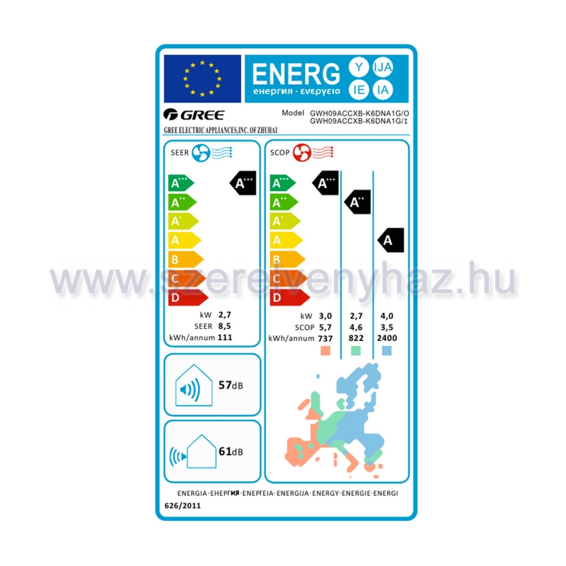 Energiaosztály: Hűtés A+++, Fűtés A++