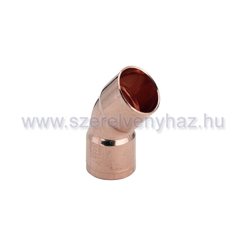 Forrasztható könyök idom, vörösréz alapanyagból készült, 18 mm-es külső átmérőjű rézcsövekhez. Két tokos kialakítású, 45°-os szögben történő elágazásra alkalmas. Alkalmas víz- és fűtéstechnikai rendszerek, csapadékvíz-elvezetés, sűrített levegős rendszerek és gázvezetékek szerelésére.