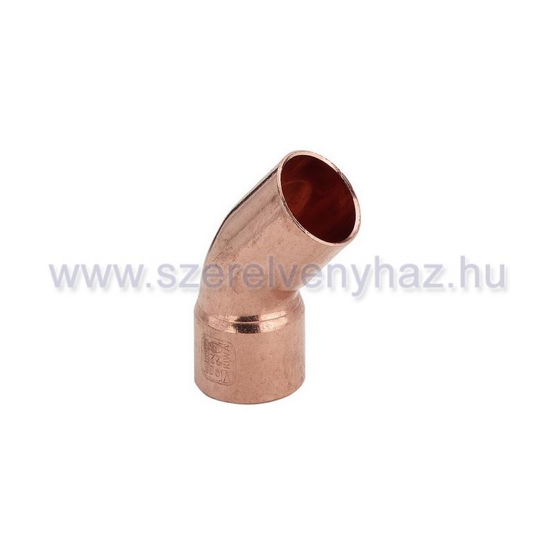 Forrasztható könyök idom, vörösréz alapanyagból készült, 18 mm-es külső átmérőjű rézcsövekhez. 45°-os szögben történő elágazásra alkalmas. Alkalmas ivóvíz- és fűtési rendszerekhez, csapadékvíz-elvezetéshez, sűrített levegős rendszerekhez és gázvezetékekhez.